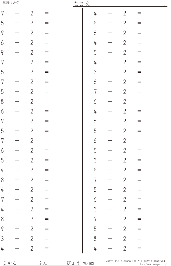 上記のボタンから「A-2」の算数数学ドリル・計算ドリル(PDFプリント)がダウンロードできます。個人利用は無料です(家庭以外での配布は有料です)。