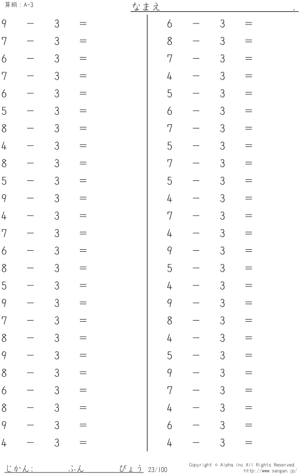上記のボタンから「A-3」の算数数学ドリル・計算ドリル(PDFプリント)がダウンロードできます。個人利用は無料です(家庭以外での配布は有料です)。