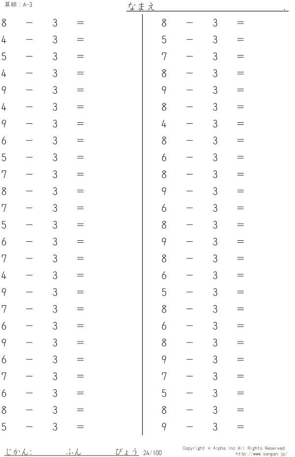 上記のボタンから「A-3」の算数数学ドリル・計算ドリル(PDFプリント)がダウンロードできます。個人利用は無料です(家庭以外での配布は有料です)。
