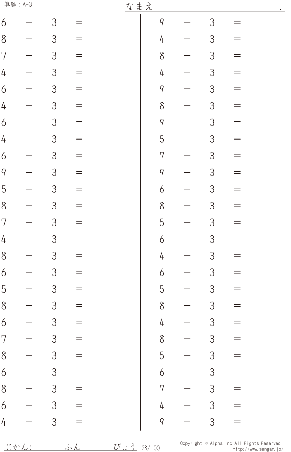上記のボタンから「A-3」の算数数学ドリル・計算ドリル(PDFプリント)がダウンロードできます。個人利用は無料です(家庭以外での配布は有料です)。