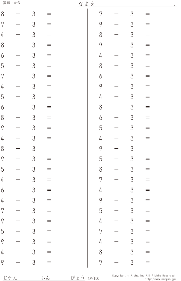 上記のボタンから「A-3」の算数数学ドリル・計算ドリル(PDFプリント)がダウンロードできます。個人利用は無料です(家庭以外での配布は有料です)。