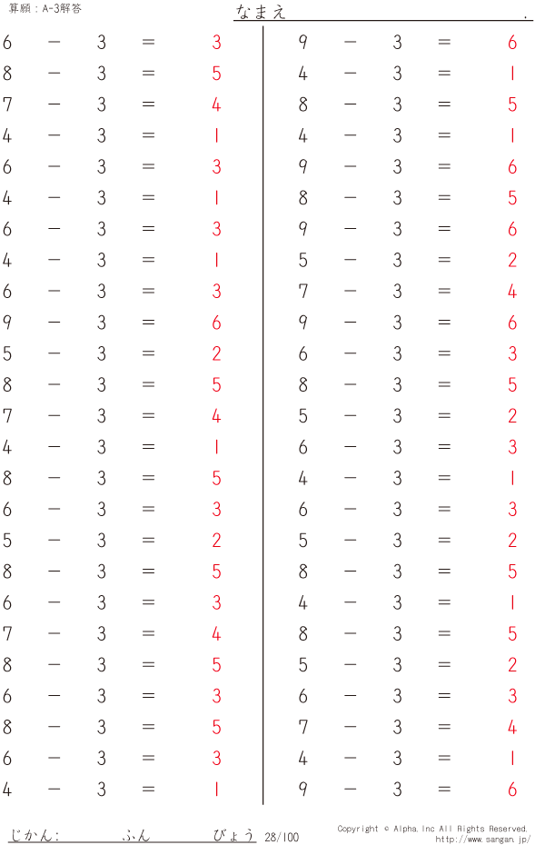 上記のボタンから「A-3」の算数数学ドリル・計算ドリル(PDFプリント)がダウンロードできます。個人利用は無料です(家庭以外での配布は有料です)。