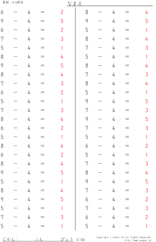 上記のボタンから「A-4」の算数数学ドリル・計算ドリル(PDFプリント)がダウンロードできます。個人利用は無料です(家庭以外での配布は有料です)。