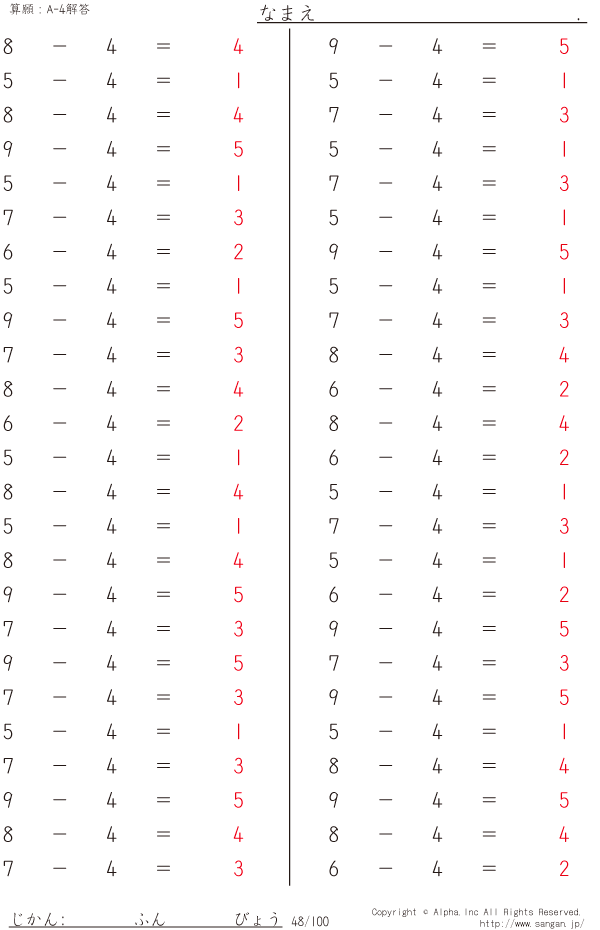 上記のボタンから「A-4」の算数数学ドリル・計算ドリル(PDFプリント)がダウンロードできます。個人利用は無料です(家庭以外での配布は有料です)。
