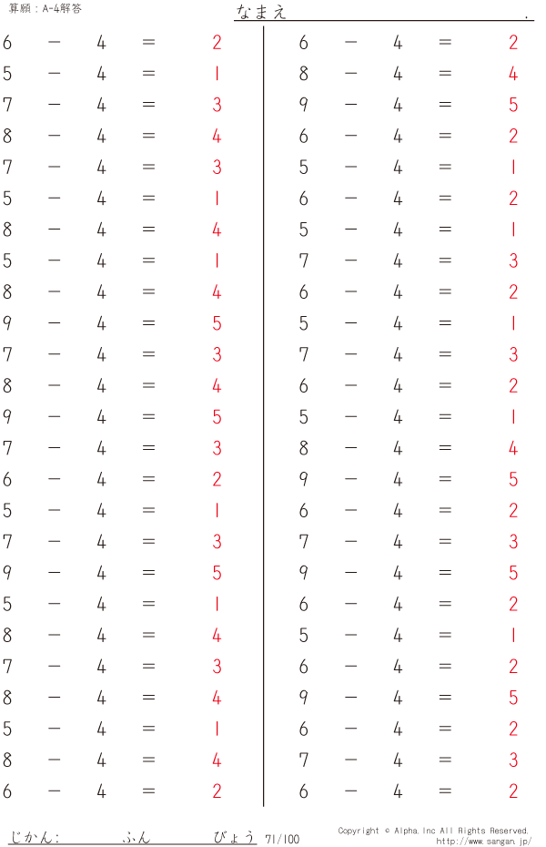 上記のボタンから「A-4」の算数数学ドリル・計算ドリル(PDFプリント)がダウンロードできます。個人利用は無料です(家庭以外での配布は有料です)。
