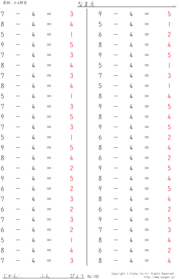 上記のボタンから「A-4」の算数数学ドリル・計算ドリル(PDFプリント)がダウンロードできます。個人利用は無料です(家庭以外での配布は有料です)。