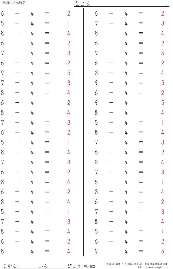 上記のボタンから「A-4」の算数数学ドリル・計算ドリル(PDFプリント)がダウンロードできます。個人利用は無料です(家庭以外での配布は有料です)。