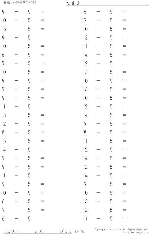 上記のボタンから「A-5繰り下がりあり」の算数数学ドリル・計算ドリル(PDFプリント)がダウンロードできます。個人利用は無料です(家庭以外での配布は有料です)。