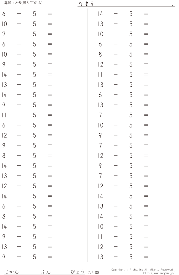 上記のボタンから「A-5繰り下がりあり」の算数数学ドリル・計算ドリル(PDFプリント)がダウンロードできます。個人利用は無料です(家庭以外での配布は有料です)。