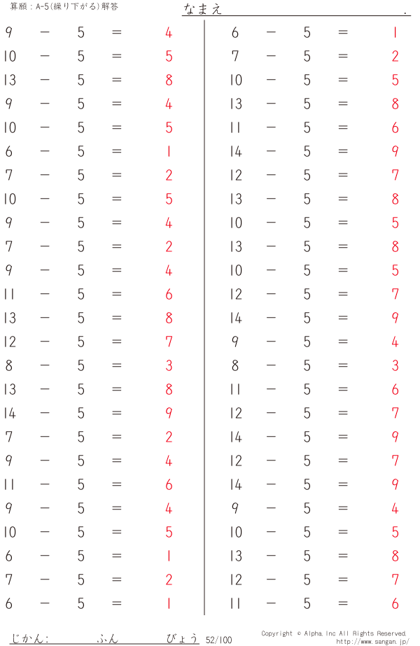 上記のボタンから「A-5繰り下がりあり」の算数数学ドリル・計算ドリル(PDFプリント)がダウンロードできます。個人利用は無料です(家庭以外での配布は有料です)。