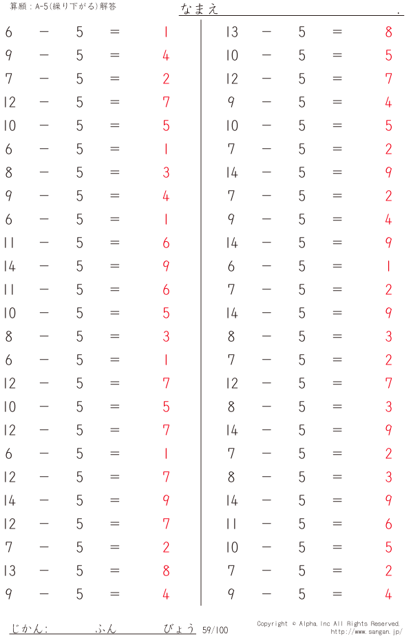 上記のボタンから「A-5繰り下がりあり」の算数数学ドリル・計算ドリル(PDFプリント)がダウンロードできます。個人利用は無料です(家庭以外での配布は有料です)。