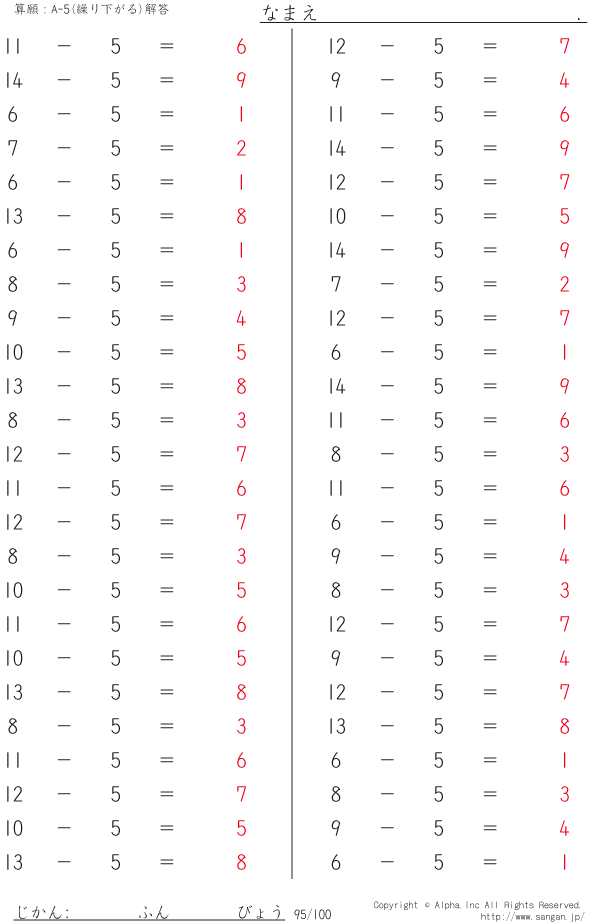 上記のボタンから「A-5繰り下がりあり」の算数数学ドリル・計算ドリル(PDFプリント)がダウンロードできます。個人利用は無料です(家庭以外での配布は有料です)。