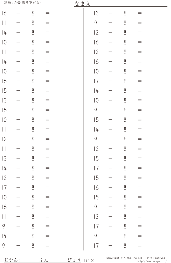 上記のボタンから「A-8繰り下がりあり」の算数数学ドリル・計算ドリル(PDFプリント)がダウンロードできます。個人利用は無料です(家庭以外での配布は有料です)。