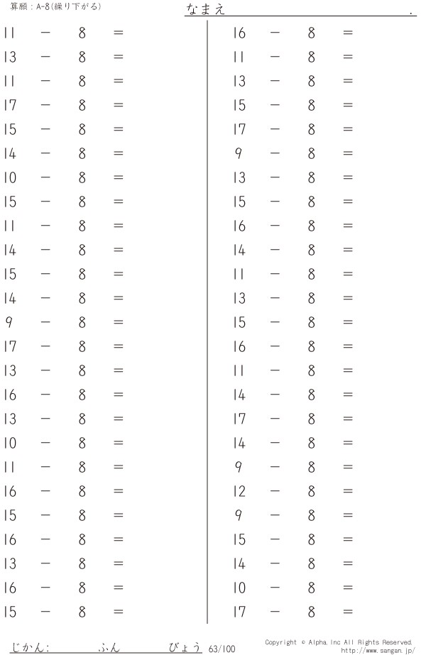 上記のボタンから「A-8繰り下がりあり」の算数数学ドリル・計算ドリル(PDFプリント)がダウンロードできます。個人利用は無料です(家庭以外での配布は有料です)。