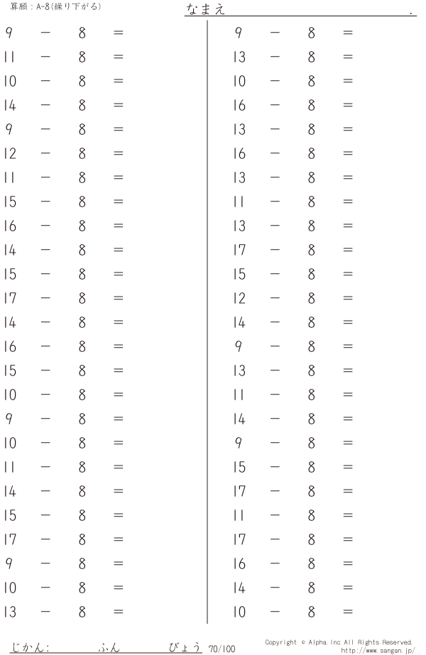 上記のボタンから「A-8繰り下がりあり」の算数数学ドリル・計算ドリル(PDFプリント)がダウンロードできます。個人利用は無料です(家庭以外での配布は有料です)。