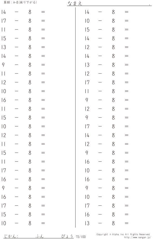 上記のボタンから「A-8繰り下がりあり」の算数数学ドリル・計算ドリル(PDFプリント)がダウンロードできます。個人利用は無料です(家庭以外での配布は有料です)。