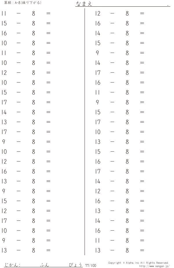 上記のボタンから「A-8繰り下がりあり」の算数数学ドリル・計算ドリル(PDFプリント)がダウンロードできます。個人利用は無料です(家庭以外での配布は有料です)。