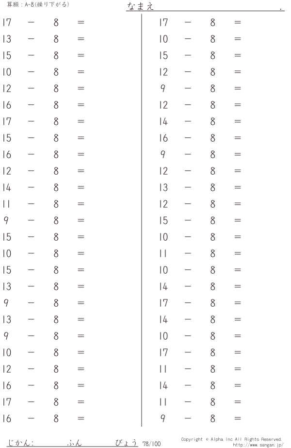 上記のボタンから「A-8繰り下がりあり」の算数数学ドリル・計算ドリル(PDFプリント)がダウンロードできます。個人利用は無料です(家庭以外での配布は有料です)。