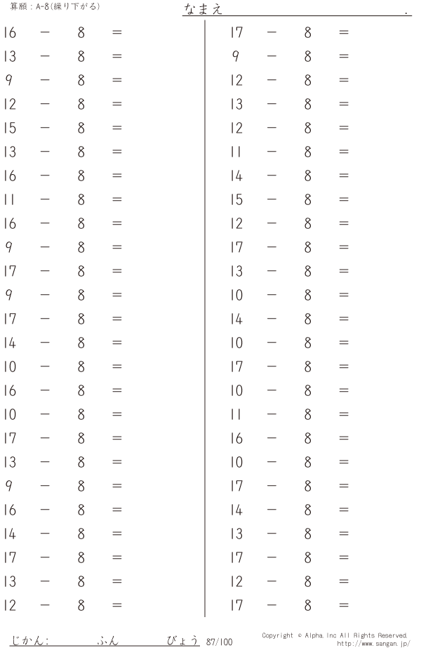 上記のボタンから「A-8繰り下がりあり」の算数数学ドリル・計算ドリル(PDFプリント)がダウンロードできます。個人利用は無料です(家庭以外での配布は有料です)。