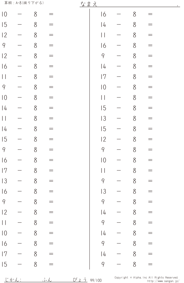 上記のボタンから「A-8繰り下がりあり」の算数数学ドリル・計算ドリル(PDFプリント)がダウンロードできます。個人利用は無料です(家庭以外での配布は有料です)。