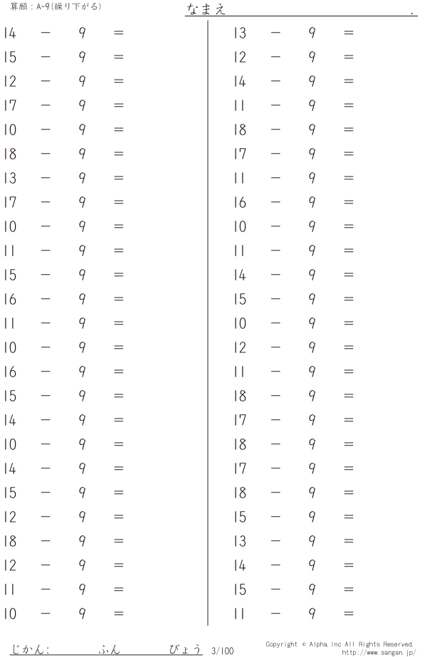上記のボタンから「A-9繰り下がりあり」の算数数学ドリル・計算ドリル(PDFプリント)がダウンロードできます。個人利用は無料です(家庭以外での配布は有料です)。
