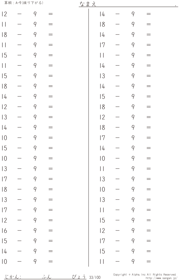 上記のボタンから「A-9繰り下がりあり」の算数数学ドリル・計算ドリル(PDFプリント)がダウンロードできます。個人利用は無料です(家庭以外での配布は有料です)。