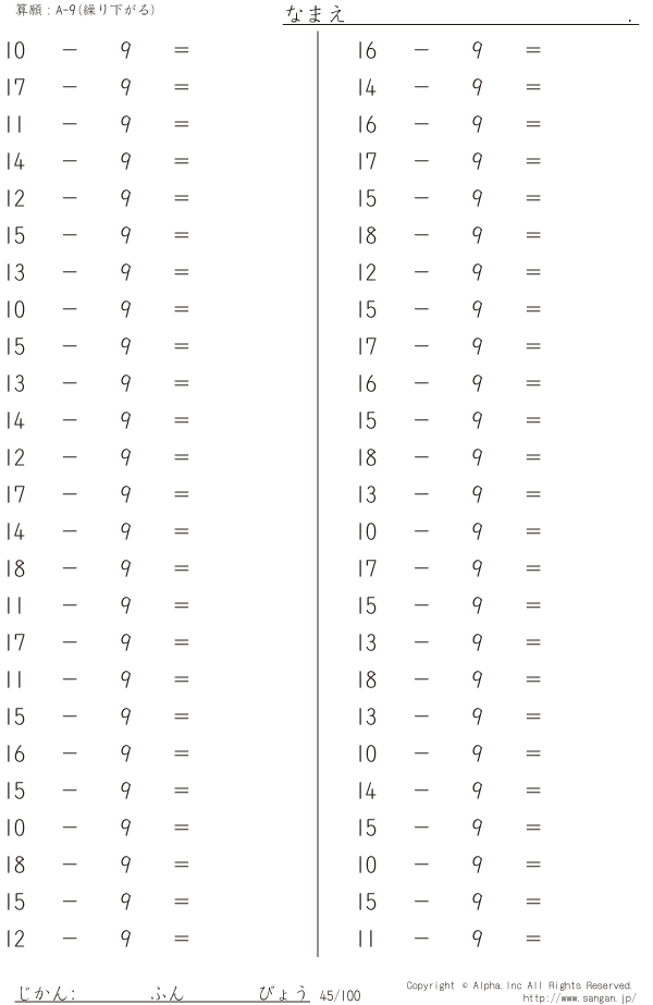 上記のボタンから「A-9繰り下がりあり」の算数数学ドリル・計算ドリル(PDFプリント)がダウンロードできます。個人利用は無料です(家庭以外での配布は有料です)。