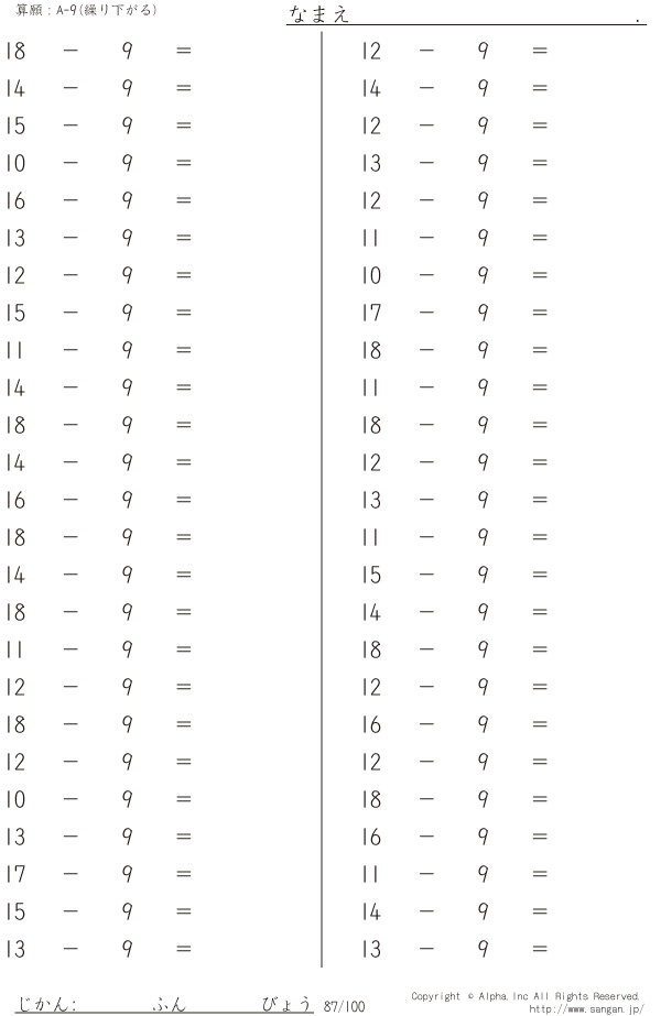 上記のボタンから「A-9繰り下がりあり」の算数数学ドリル・計算ドリル(PDFプリント)がダウンロードできます。個人利用は無料です(家庭以外での配布は有料です)。