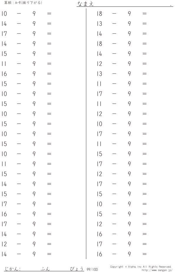上記のボタンから「A-9繰り下がりあり」の算数数学ドリル・計算ドリル(PDFプリント)がダウンロードできます。個人利用は無料です(家庭以外での配布は有料です)。