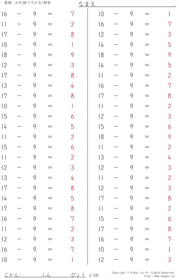 上記のボタンから「A-9繰り下がりあり」の算数数学ドリル・計算ドリル(PDFプリント)がダウンロードできます。個人利用は無料です(家庭以外での配布は有料です)。