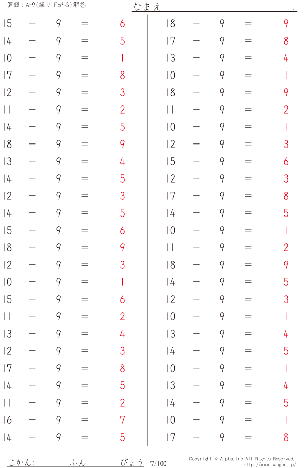 上記のボタンから「A-9繰り下がりあり」の算数数学ドリル・計算ドリル(PDFプリント)がダウンロードできます。個人利用は無料です(家庭以外での配布は有料です)。