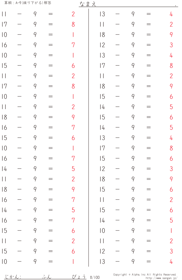 上記のボタンから「A-9繰り下がりあり」の算数数学ドリル・計算ドリル(PDFプリント)がダウンロードできます。個人利用は無料です(家庭以外での配布は有料です)。