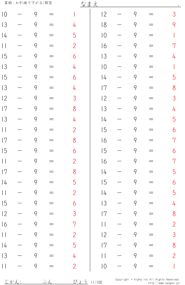 上記のボタンから「A-9繰り下がりあり」の算数数学ドリル・計算ドリル(PDFプリント)がダウンロードできます。個人利用は無料です(家庭以外での配布は有料です)。