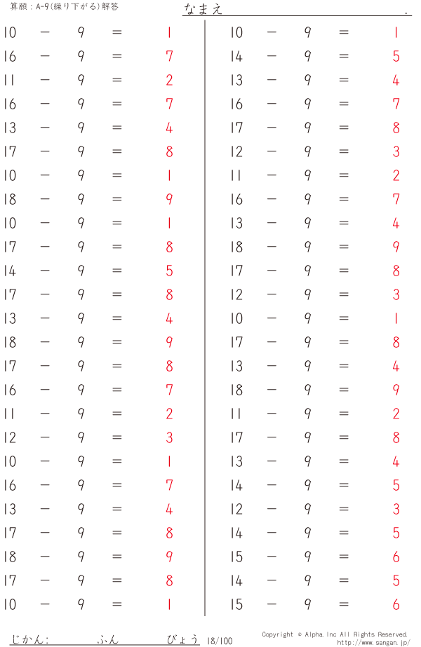 A-9繰り下がりあり [解答]018/100