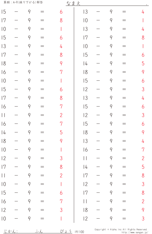 上記のボタンから「A-9繰り下がりあり」の算数数学ドリル・計算ドリル(PDFプリント)がダウンロードできます。個人利用は無料です(家庭以外での配布は有料です)。