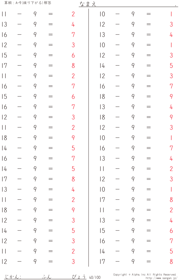 上記のボタンから「A-9繰り下がりあり」の算数数学ドリル・計算ドリル(PDFプリント)がダウンロードできます。個人利用は無料です(家庭以外での配布は有料です)。