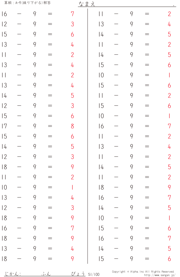 上記のボタンから「A-9繰り下がりあり」の算数数学ドリル・計算ドリル(PDFプリント)がダウンロードできます。個人利用は無料です(家庭以外での配布は有料です)。