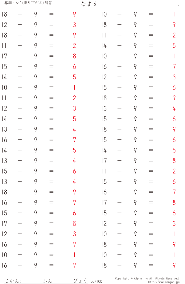 上記のボタンから「A-9繰り下がりあり」の算数数学ドリル・計算ドリル(PDFプリント)がダウンロードできます。個人利用は無料です(家庭以外での配布は有料です)。