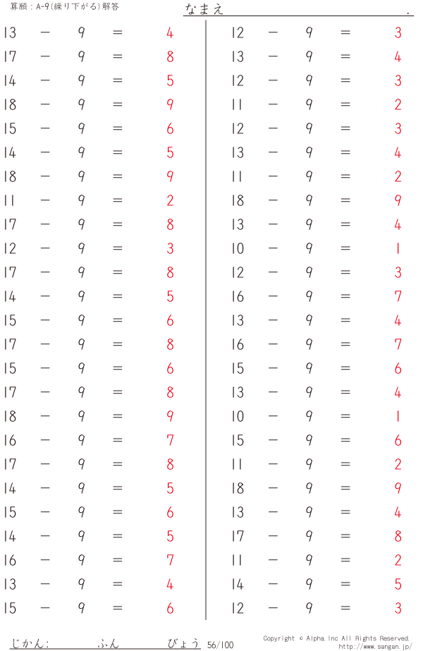 上記のボタンから「A-9繰り下がりあり」の算数数学ドリル・計算ドリル(PDFプリント)がダウンロードできます。個人利用は無料です(家庭以外での配布は有料です)。