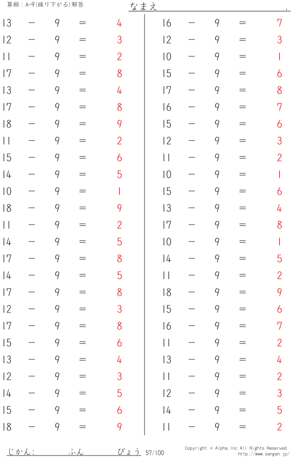 上記のボタンから「A-9繰り下がりあり」の算数数学ドリル・計算ドリル(PDFプリント)がダウンロードできます。個人利用は無料です(家庭以外での配布は有料です)。