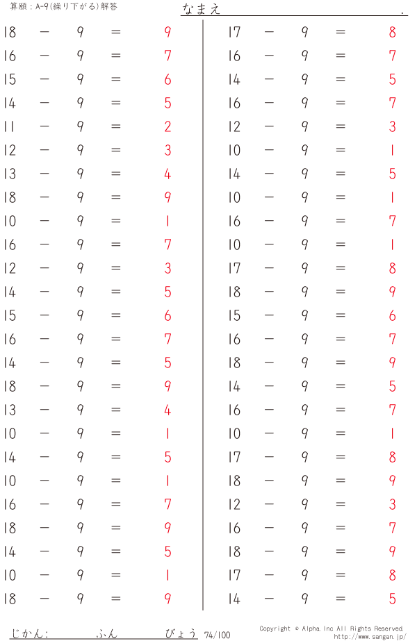 上記のボタンから「A-9繰り下がりあり」の算数数学ドリル・計算ドリル(PDFプリント)がダウンロードできます。個人利用は無料です(家庭以外での配布は有料です)。