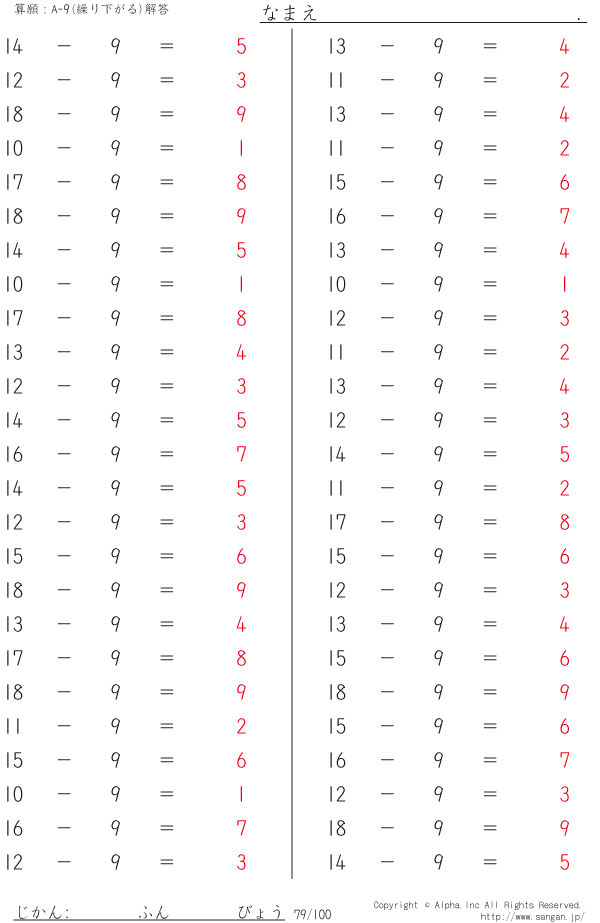 上記のボタンから「A-9繰り下がりあり」の算数数学ドリル・計算ドリル(PDFプリント)がダウンロードできます。個人利用は無料です(家庭以外での配布は有料です)。