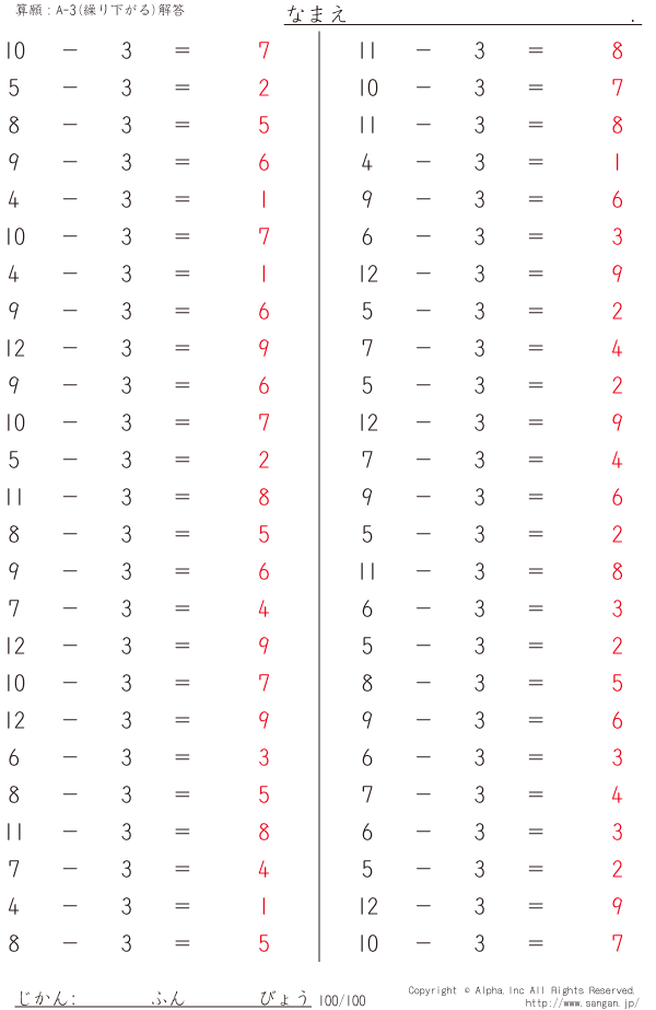 上記のボタンから「A-3…繰り下がりあり」の算数数学ドリル・計算ドリル(PDFプリント)がダウンロードできます。個人利用は無料です(家庭以外での配布は有料です)。