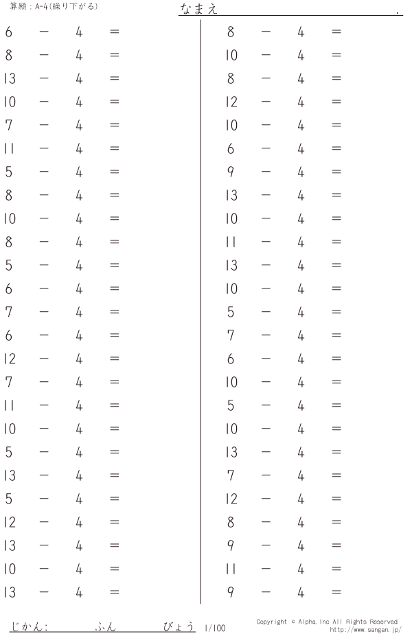 上記のボタンから「A-4…繰り下がりあり」の算数数学ドリル・計算ドリル(PDFプリント)がダウンロードできます。個人利用は無料です(家庭以外での配布は有料です)。