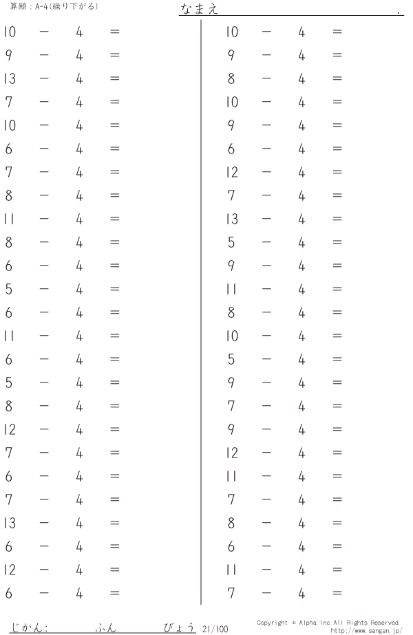 上記のボタンから「A-4…繰り下がりあり」の算数数学ドリル・計算ドリル(PDFプリント)がダウンロードできます。個人利用は無料です(家庭以外での配布は有料です)。