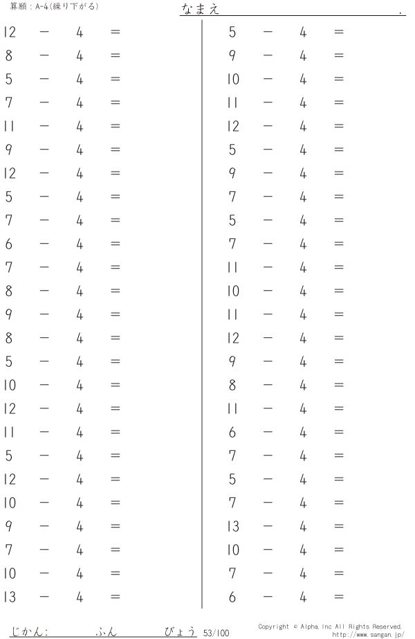 上記のボタンから「A-4…繰り下がりあり」の算数数学ドリル・計算ドリル(PDFプリント)がダウンロードできます。個人利用は無料です(家庭以外での配布は有料です)。