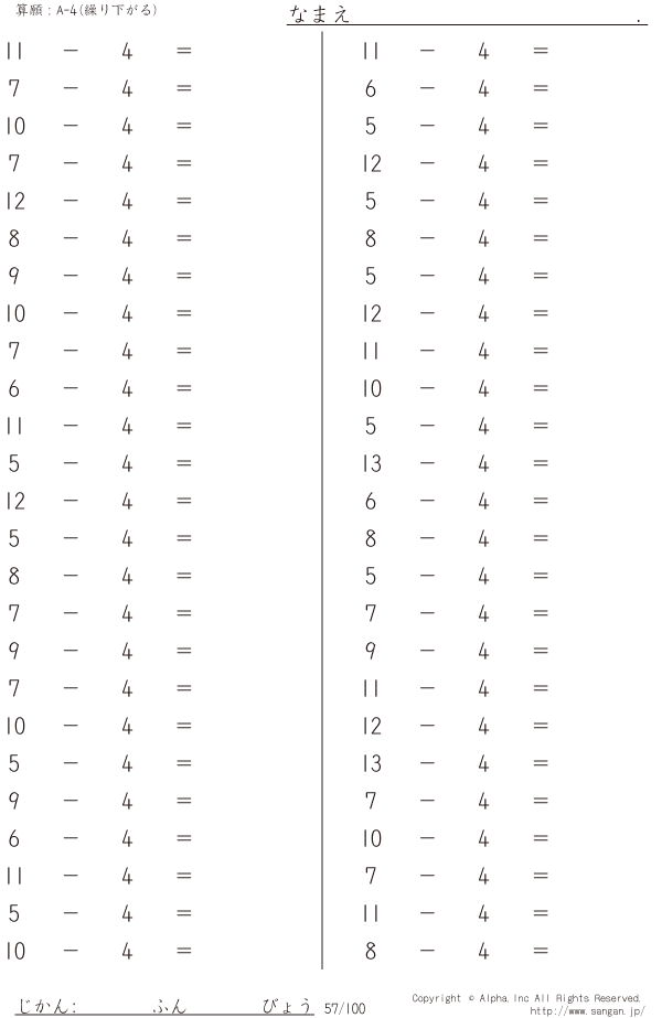 上記のボタンから「A-4…繰り下がりあり」の算数数学ドリル・計算ドリル(PDFプリント)がダウンロードできます。個人利用は無料です(家庭以外での配布は有料です)。