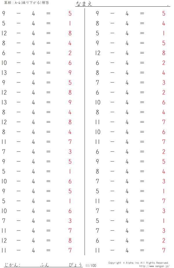 上記のボタンから「A-4…繰り下がりあり」の算数数学ドリル・計算ドリル(PDFプリント)がダウンロードできます。個人利用は無料です(家庭以外での配布は有料です)。