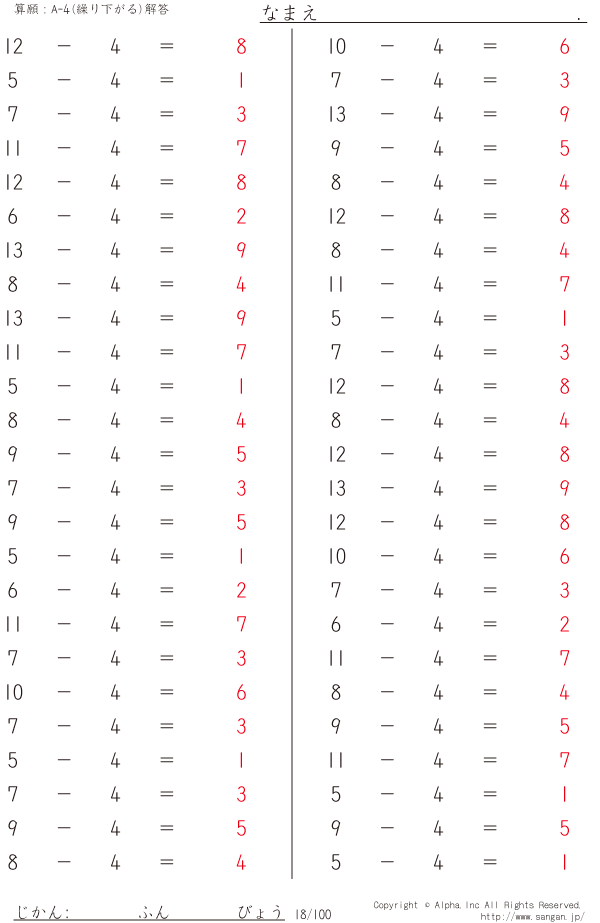 上記のボタンから「A-4…繰り下がりあり」の算数数学ドリル・計算ドリル(PDFプリント)がダウンロードできます。個人利用は無料です(家庭以外での配布は有料です)。