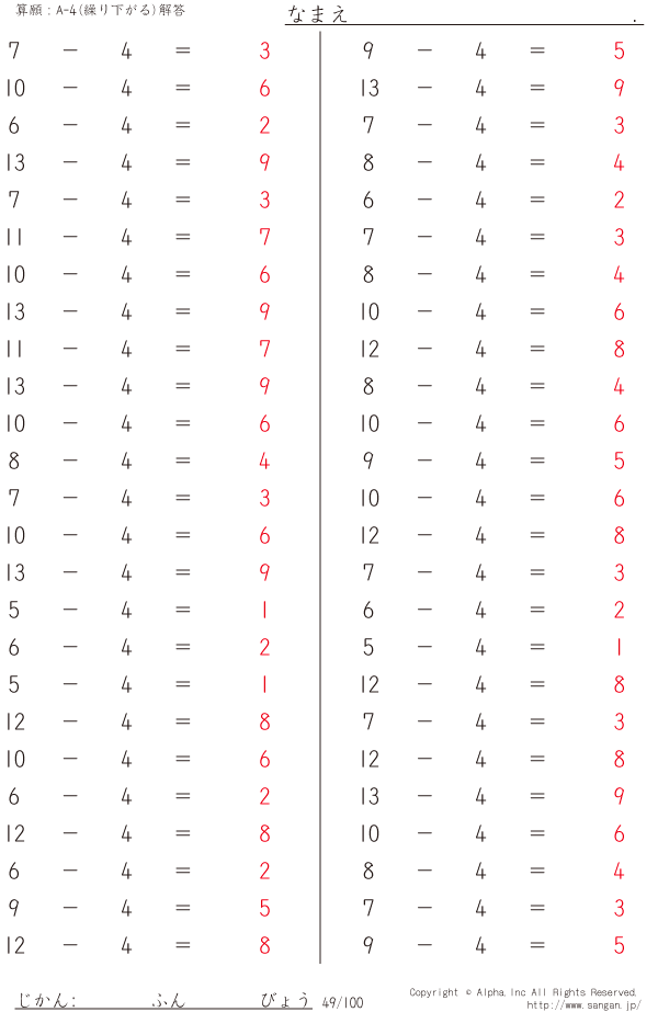 上記のボタンから「A-4…繰り下がりあり」の算数数学ドリル・計算ドリル(PDFプリント)がダウンロードできます。個人利用は無料です(家庭以外での配布は有料です)。